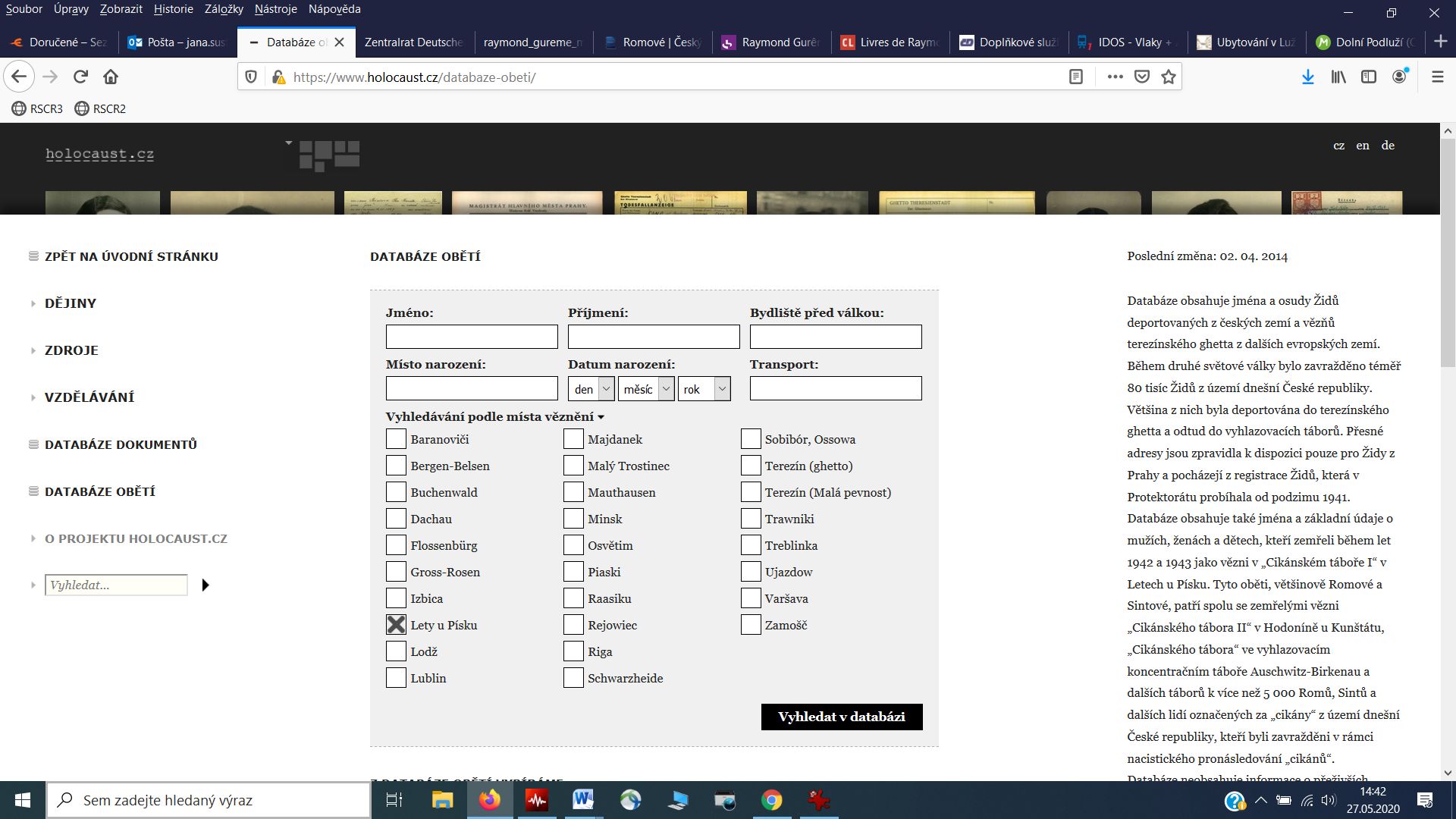 Databáze obětí holocaustu na webu Holocaust.cz obsahuje od letošního roku také údaje o obětech rasového pronásledování Romů, Sintů a dalších osob označovaných za „cikány“. Zatím v ní najdeme údaje o tři sta dvaceti devíti obětech takzvaného cikánského tábora Lety u Písku, v budoucnu přibydou i další. Databázi vytváří Institut Terezínské iniciativy.