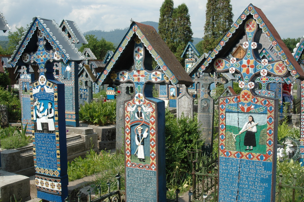 Stovky dřevěných křížů s dominantní modrou barvou a pestrými portréty zesnulých v lidovém stylu najdeme na Veselém hřbitově v rumunské vesnici Săpânţa v Maramureši. Každý zesnulý je na svém dřevěném pomníčku zobrazen s tím, co ho nejvíc charakterizuje – většinou je to povolání, nějaká záliba nebo způsob smrti. Takže na křížích vidíme pastýře, přadleny, hospodyně, truhláře i horníky, řidiče aut, traktorů či kamionů, opraváře televizí, vojáky i kněze, stejně tak jako pijana, tchyni nebo funkcionáře komunistické strany.